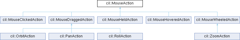 cil::MouseClickedAction cil::MouseDraggedAction cil::MouseHeldAction cil::MouseHoveredAction cil::MouseWheeledAction cil::OrbitAction cil::PanAction cil::RollAction cil::ZoomAction
