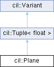 The Plane class inherits from the Tuple class, specilizing the templated parameter to float for element type. More...