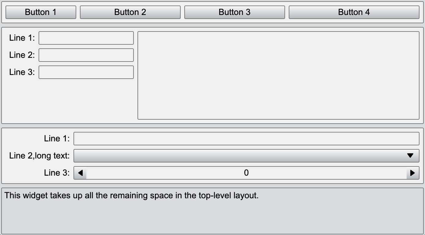 接下来,我们使用这几个模块实现下面的布局,从外向内来看,在最外面是一个垂直布局VBoxLayout,该布局的内侧与其内部所有控件留有一定的间隙。在该布局内,依次添加两个水平布局HBoxLayout,一个表格布局FormLayout,以及一个基础控件textEdit。