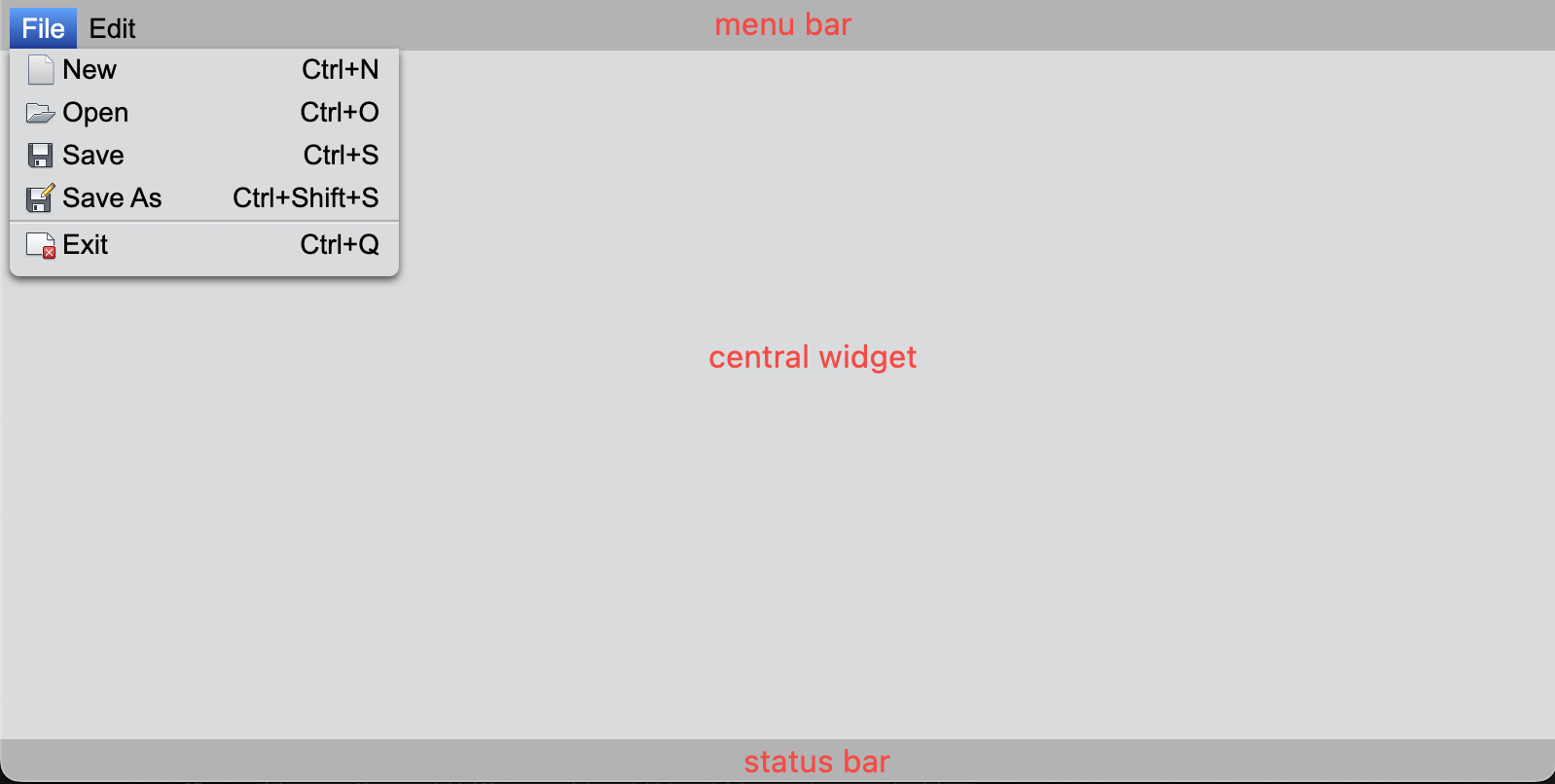 运行下面的代码,可以初始化一个主窗口,它默认包含了空的菜单栏、中心窗口和状态栏,后续开发者可以向这些区域中添加业务控件。